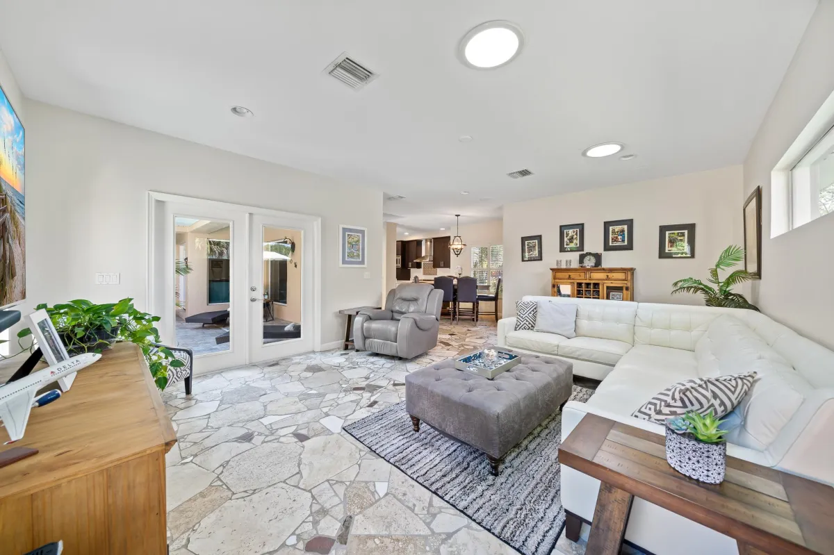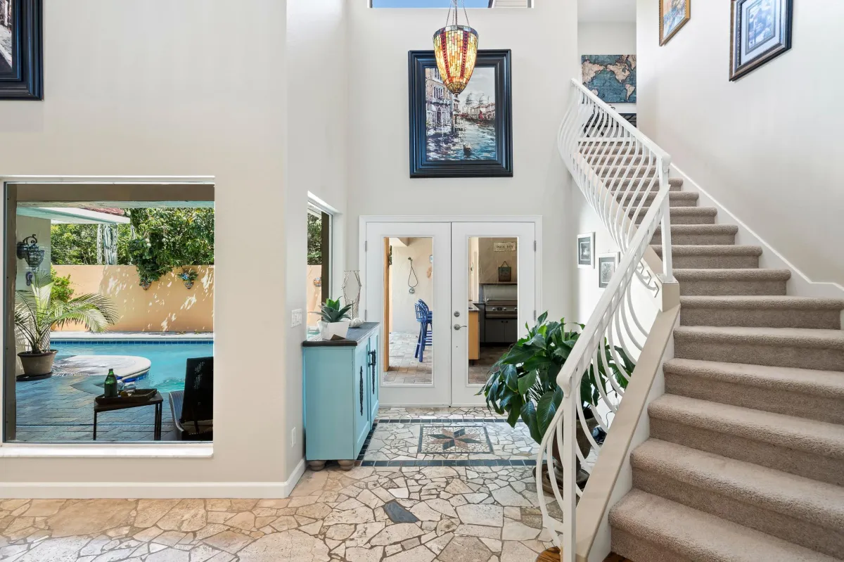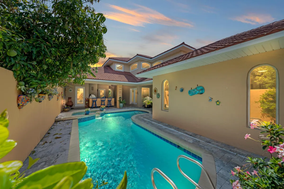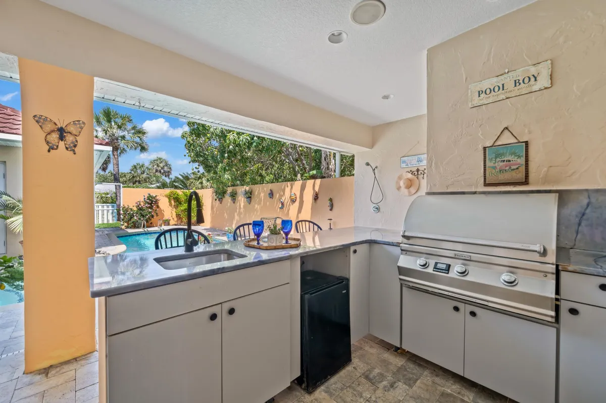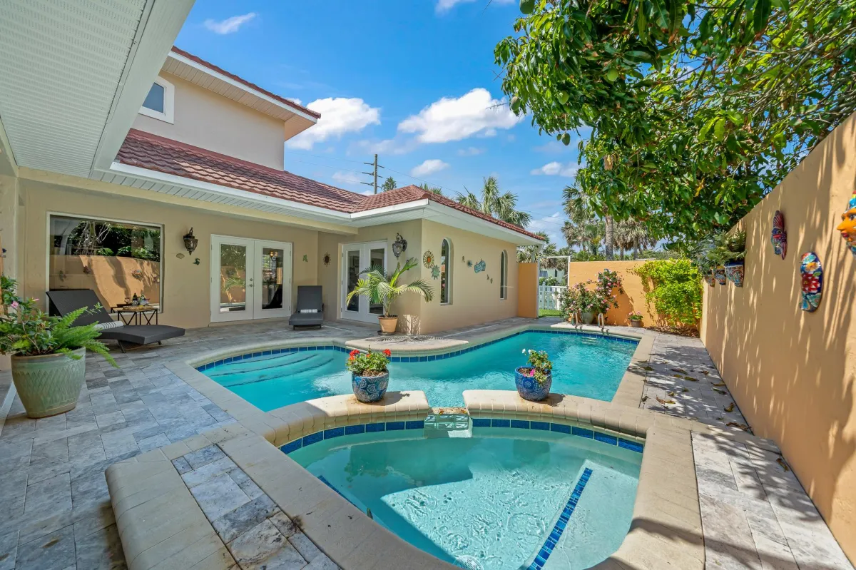 Introducing a stunning beachside property for sale, nestled in a prime location across the street from the ocean. The captivating courtyard pool area with summer kitchen is an oasis of serenity, inviting relaxation and outdoor entertainment. The enchanting, lush landscaping allows for privacy from A1A while still hearing the soothing sound of the waves merging with the rustling of palm trees. The kitchen has been updated with custom cabinetry, quartz countertops and stainless-steel appliances including a gas stove. The Spacious master suite has balcony with partial ocean views where you can enjoy your coffee. The luxurious master bath has been remodeled and has a large shower, soaking tub, quartz countertops with dual sinks and even a sauna!